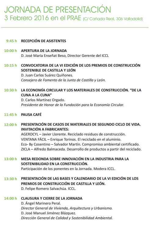 Los Premios de Construcción Sostenible de Castilla y León son una iniciativa de la Consejería de Fomento y de Medio Ambiente de la Junta de Castilla y León en colaboración con el Instituto de la Construcción de Castilla y León. Se pretende distinguir con los Premios de Construcción Sostenible de Castilla y León 6ª Edición 2015-2016, a los proyectos y actuaciones de construcción realizados durante el período definido en esta convocatoria que, habiendo demostrado un enfoque comportamiento sostenible frente a los múltiples aspectos ambientales que afectan a la edificación.