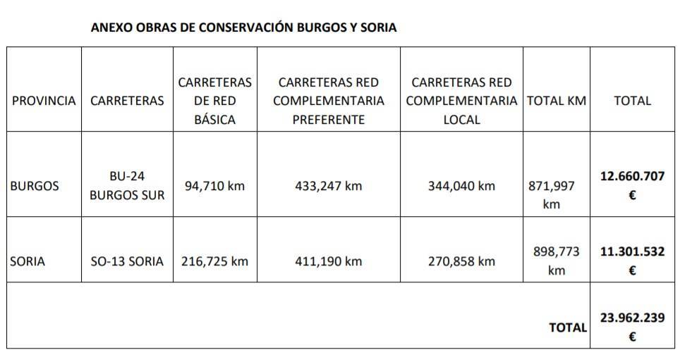 En el documento anexo se detallan las obras en cada una de las provincias: ANEXO OBRAS DE CONSERVACION BURGOS Y SORIA