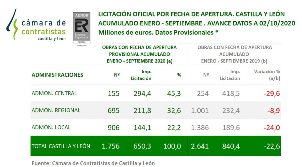El avance provisional de la licitación pública correspondiente al periodo ENERO-SEPTIEMBRE de 2020, deja un acumulado de 650 millones de euros en Castilla y León con una variación negativa del 23 % respecto al mismo periodo del 2019.