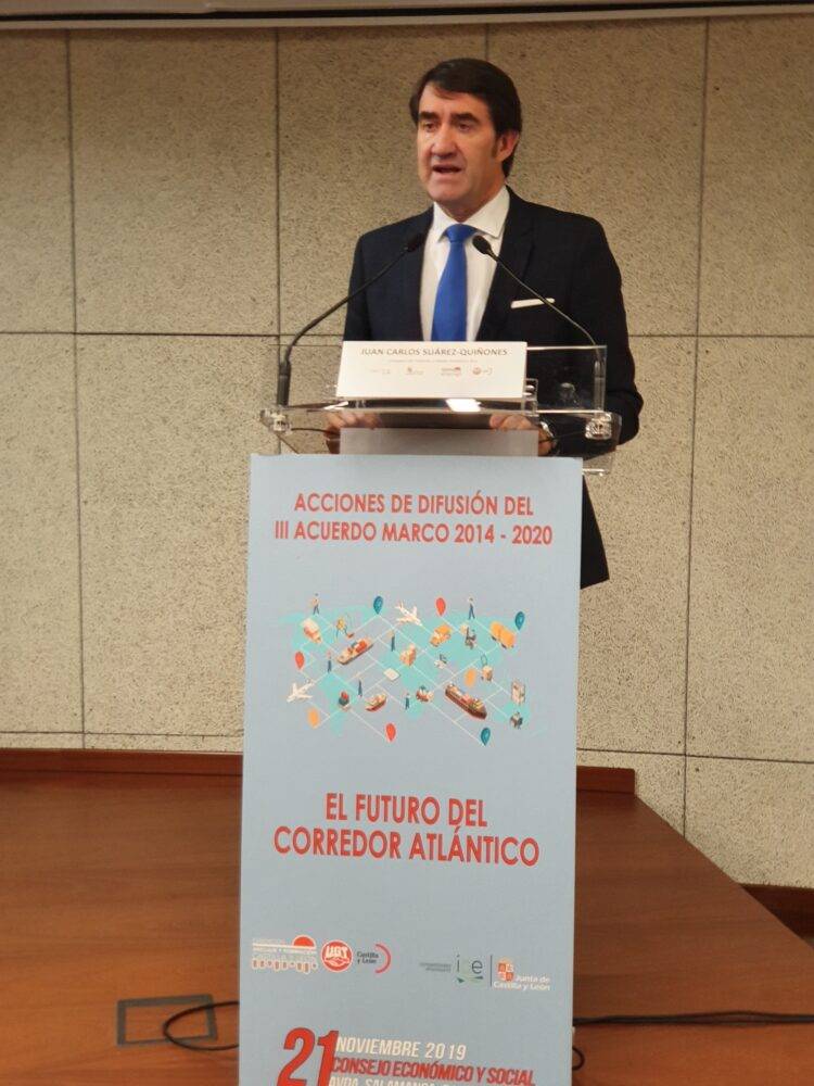 El consejero de Fomento y Medio Ambiente, Juan Carlos Suárez-Quiñones, ha pronunciado hoy en Valladolid la conferencia ‘Presente y futuro’, dentro del programa de la jornada ‘El Futuro del Corredor Atlantico’, organizada por UGT