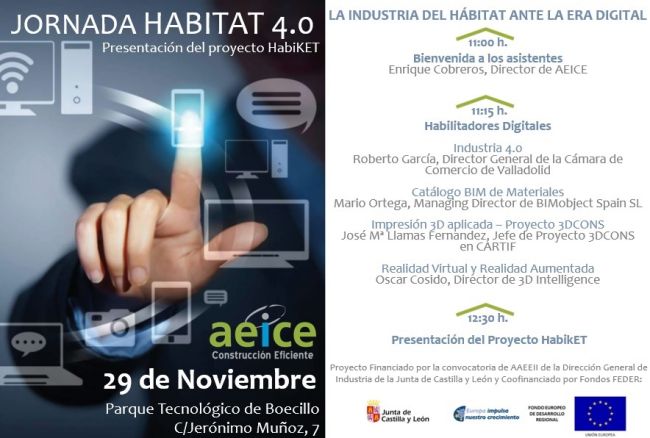 El próximo martes 29 de noviembre a las 11 hrs, en el Parque Tecnológico de Boecillo (C/Jerónimo Muñoz, 7), AEICE organiza la Jornada Hábitat 4.0, donde empresas e instituciones presentarán diferentes temáticas en relación a la revolución digital que ya está entre nosotros y a la cual todas las entidades debemos adaptarnos.