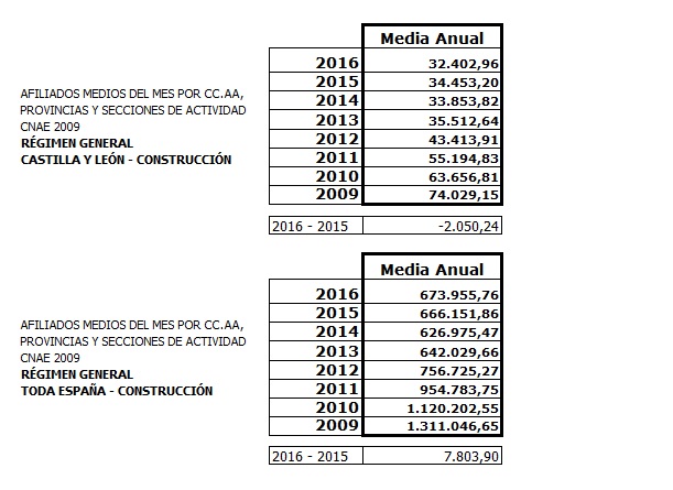 La Construcción en Castilla y León continúa perdiendo afiliados en la Seguridad Social respecto la media anual del 2015.