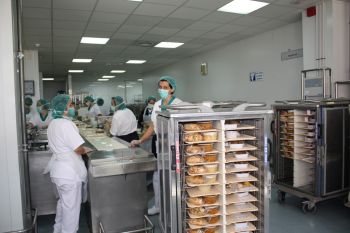 El sistema previsto es el siguiente: la fabricación se realizará de lunes a viernes, para su distribución durante los siete días de la semana, desayuno y merienda en línea caliente y almuerzos y cenas en línea fría. Para la distribución en línea fría son necesarias todas las instalaciones correspondientes para el almacenamiento del producto cocinado y refrigerado, el emplatado en bandejas en local adecuadamente climatizado y su distribución en frío mediante carros para su posterior retermalización final.