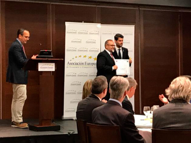 Dicho reconocimiento fue entregado por Sr. D. José Luis Barceló, presidente de Asociación Europea de Economía y Competitividad a D. Juan Gallardo Carrillo, CEO de Patrimonio inteligente. Quien tuvo la oportunidad de mencionar la importancia de pertenecer a instituciones como AEICE y la CÁMARA DE CONTRATISTAS DE CASTILLA Y LEÓN.