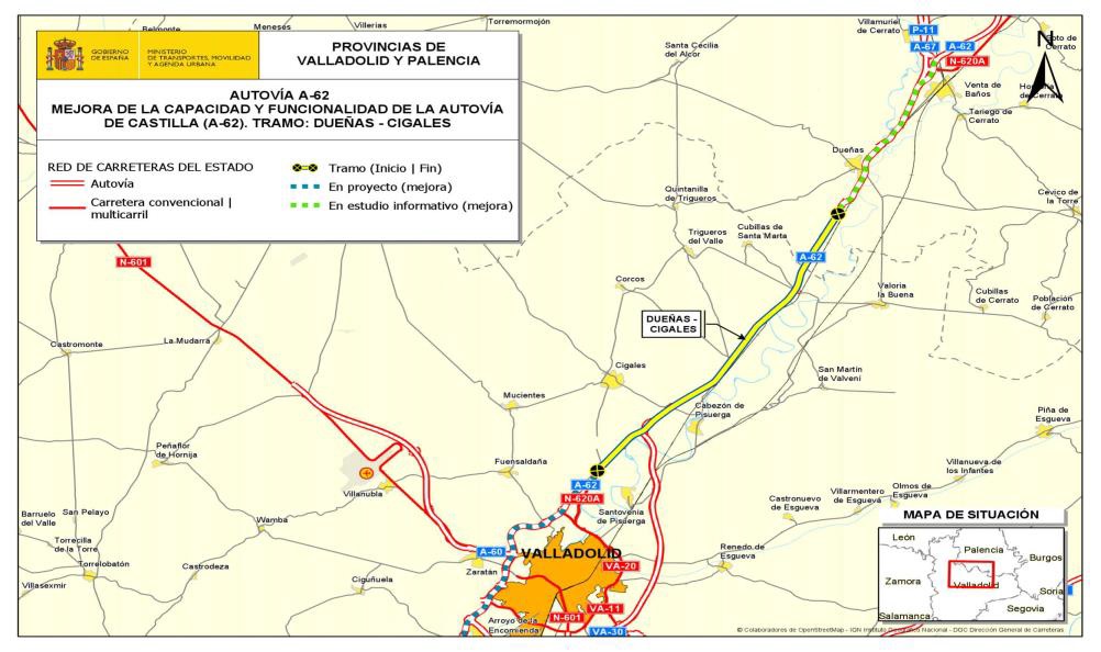 El objeto del proyecto es desarrollar las actuaciones necesarias para aumentar la capacidad y mejorar la funcionalidad de la Autovía de Castilla (A-62) en el tramo Dueñas-Cigales, con una longitud de 21,7 km, mediante la construcción de un tercer carril por cada sentido de circulación.