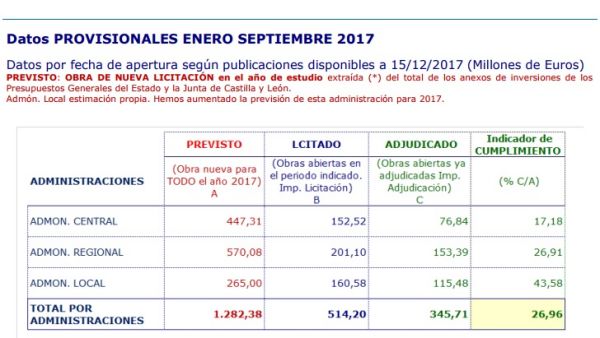 La Cámara de Contratistas de Castilla y León ha publica su boletín estadístico trimestral, con los datos provisionales por fecha de apertura correspondientes al periodo Enero – Septiembre de 2017.