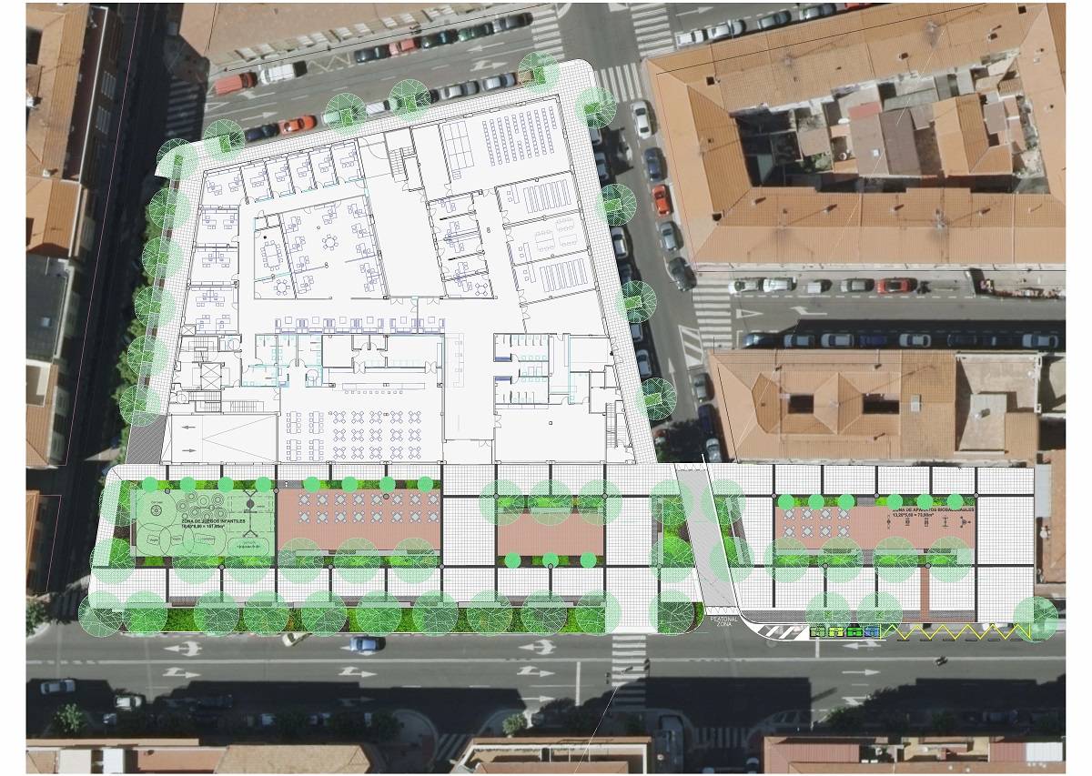 En su interior se diseñará un espacio libre peatonal en la que el arbolado y los bancos recrearán las diferentes zonas estanciales, de circulación y de acceso al edificio municipal. El arbolado seleccionado permitirá que las distintas estancias disfruten de sombra en verano y de luz en invierno.