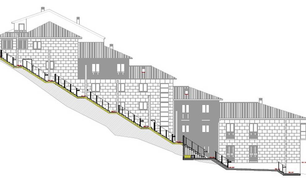 Teniendo en cuenta el ancho de cuatro metros definido por el muro de cerramiento y la fachada de la edificación limítrofe, así como la diferencia de cota de 16,2 metros y la longitud de 42 metros en proyección horizontal, se ha proyectado una escalera con un ancho de 1,40 en nueve tramos con sus correspondientes mesetas de 1,40 metros.